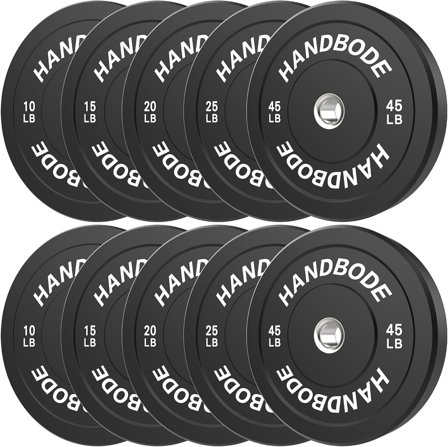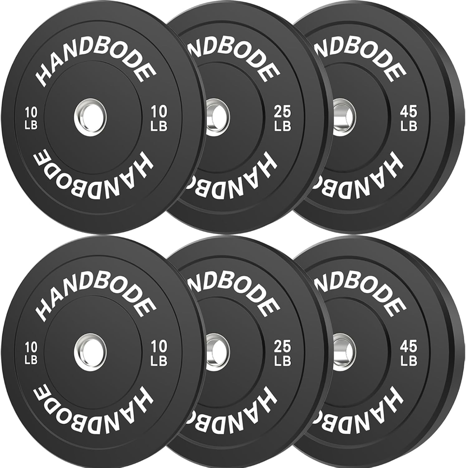 HANDBODE Crumb Bumper Plates Brand : HANDBODE Pounds or Kilograms : Pounds Weight Increments : 10/15/20/25/30/35/40/45/50/55 Plate Diameter : 17.7"/450mm Center Hole Diameter : 2"/50mm Inserts Material : Stainless Steel Plate Material : Crumb Rubber Durometer Rating : 72 ~ 75 Weight Tolerance : 2% Rubber to protect floor or bar Color-coded plate for quick identification Traditional steel plates are noisy and cannot be dropped during intense workouts or Olympic weightlifting sessions. You can drop bumper plates on the floor without damaging the plate, barbell, or floor, because they are constructed with rubber around a central metal hub. Crumb rubber's hardness rating is less than virgin rubber, it is lands softer. The Plates are coor-coded for quick identification and pick up. Crumb bumper plates are made from recycled rubber, making them an environmentally conscious choice. By using recycled materials, these plates help reduce waste and give new life to old rubber tires. If you have a home gym and want to avoid disturbing your family or neighbors, crumb bumper plates are a great choice. Their shock-absorbing properties and reduced noise levels make them ideal for a residential setting, Their ability to withstand drops and provide a bit of bounce is perfect for those explosive movements and dynamic lifts that are the heart and soul of your workout of the day.