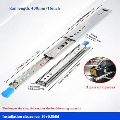 Our drawer slides are fitted with stainless steel screws for easy installation. Professional DIY application:3-Fold Full Extension,Side Mount.The slide rail can be disassembled for installation.Suitable for Goods shelf,Mechanical Cabinets,Industry-used drawer,RV,Truck,Vending machine,etc. Three-section interlocking function:Press and hold the lock handle to unlock and then pull it to the full extension of the slide rail to lock naturally.On the basis of the 3-Fold full extension, pressing the lock handle and continuing to pull it will remove the slide rail for easy installation. Specification Material: Cold Rolled Steel Color: Silver Process: Galvanized Finish Package Include 1 Pair of Heavy-Duty Drawer Slides Installation Steps 1. Find two horizontal lines in the installation position on both sides of the cabinet, and fix the outer fixed slides to the horizontal lines on both sides with screws; (Note: the positioning of both sides must be parallel). 2. Completely pull the slide rail, and fix the drawer to the inner fixed rail with screws according to the horizontal line. 3. The installation is finished. Notes 1.Please note that the locking mechanism only works when the drawer is fully closed or fully open. 2. The space between drawer and cabinet wall need to be 19mm/0.75in each side 3.Please allow the slight color difference caused by the shooting light and 1-3 cm error due to manual measurement, and make sure you do not mind before ordering.