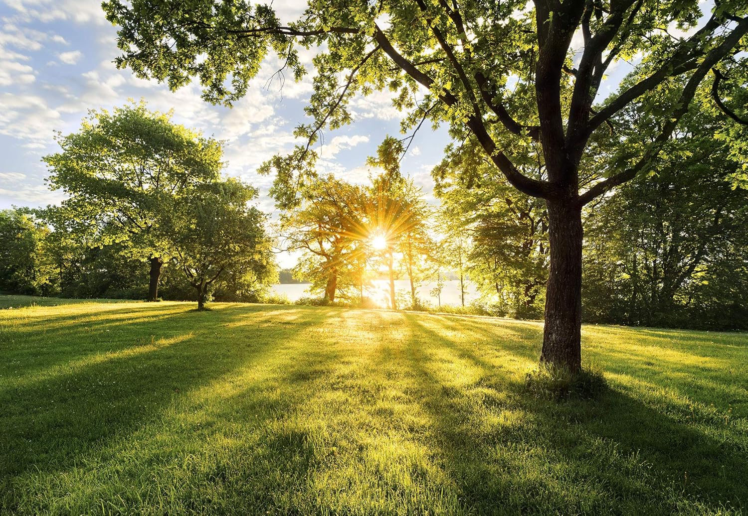 Can you imagine anything more picturesque than a perfect summer day? This wall mural features a grassy field filled with leafy green trees, the summer sun streaming through during a perfect golden hour. Golden Moment Wall Mural comes on 8 panels