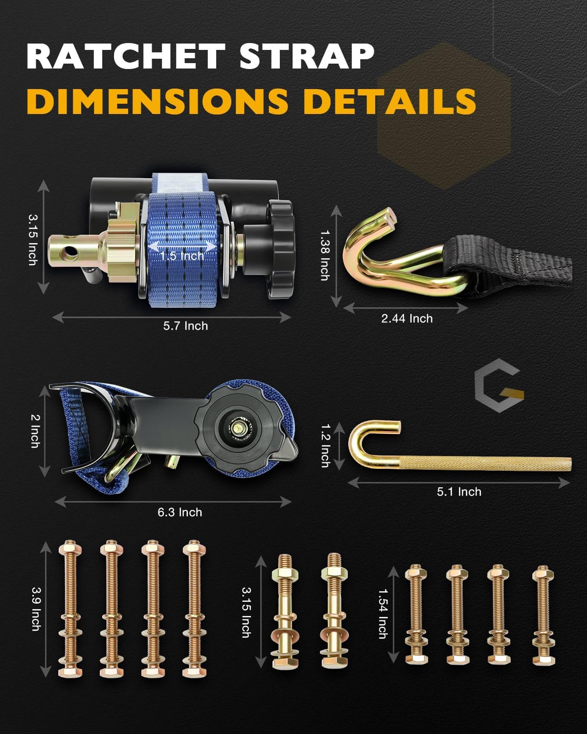 Packing List:4x Retractable Ratchet Tie Down Straps with J Hooks-Black Bracket & Blue Webbing4x Diameter Rod40x Bolt Mounting HardwareBREAKING STRENGTH: 1500 lbs || WORKING LOAD LIMIT: 500 lbsCondition: NewWork with:Our ratchet straps heavy duty are designed to provide humanity with cargo securement made efficient, simple, safe and effective. Adds convenient, permanent securing points to a ladder rack with round tubing. Our heavy duty 1.5 inch ratchet straps with j hooks are compatible with a wide range of cargo, including vehicles, furniture, appliances, and more. They can also be used on trailers, pickup trucks, and other types of transportation. They may not chain down a bridge, but they are THE STRONG SOLUTION for trailering your motorcycles and 4-wheelers, anchoring down furniture in your truck bed, securing mobility scooters to hitch trailers, tying down lawn equipment in a utility trailer.When attached to cargo rack simply unhook strap while unraveling enough to fit around desired item, hook onto one of two built-in attachment points, and take up slack with the large easy-twist knob.Tie down features 3 ways to tighten load using diameter rod, wrench, or drive socket wrench (tools not included).