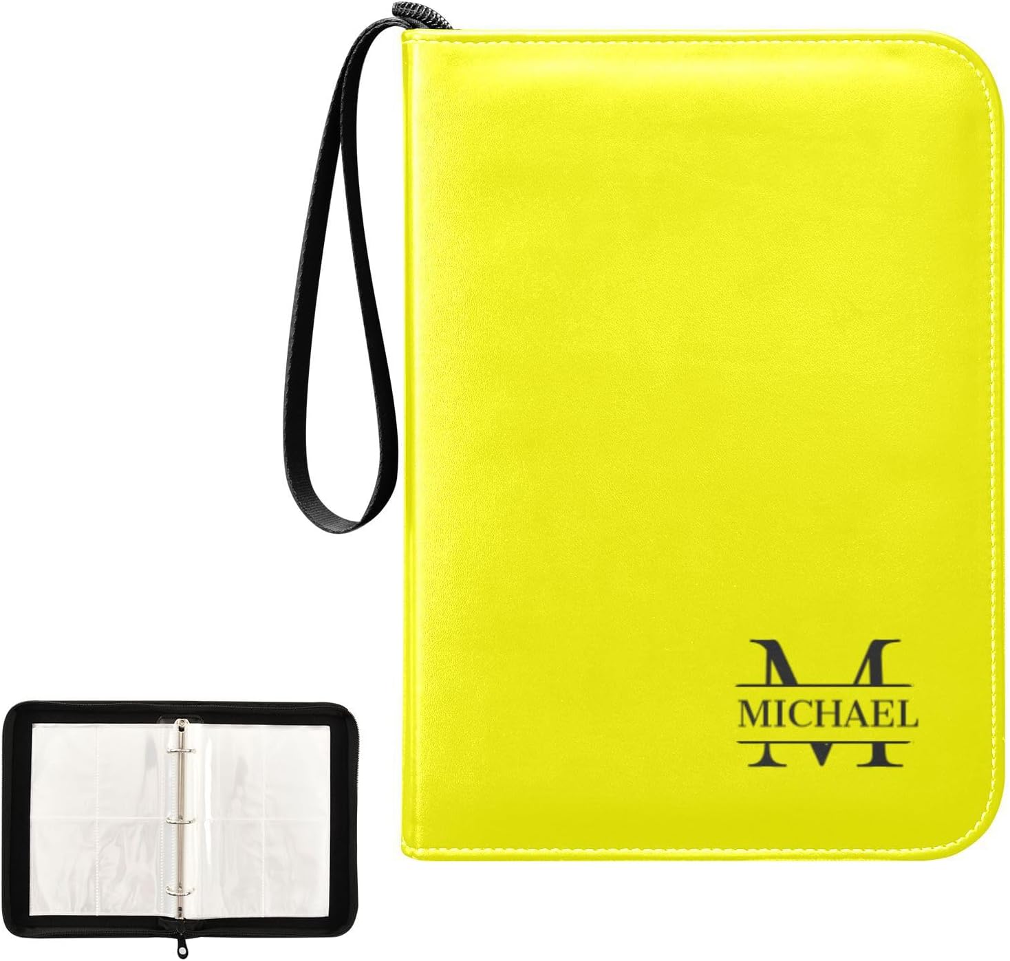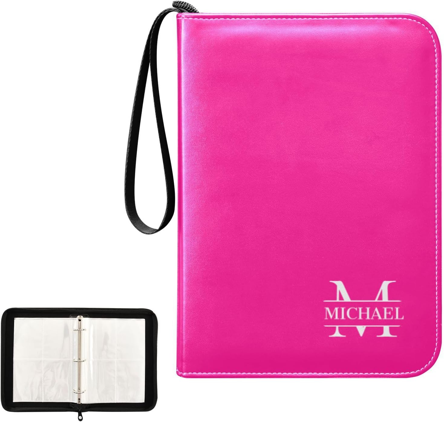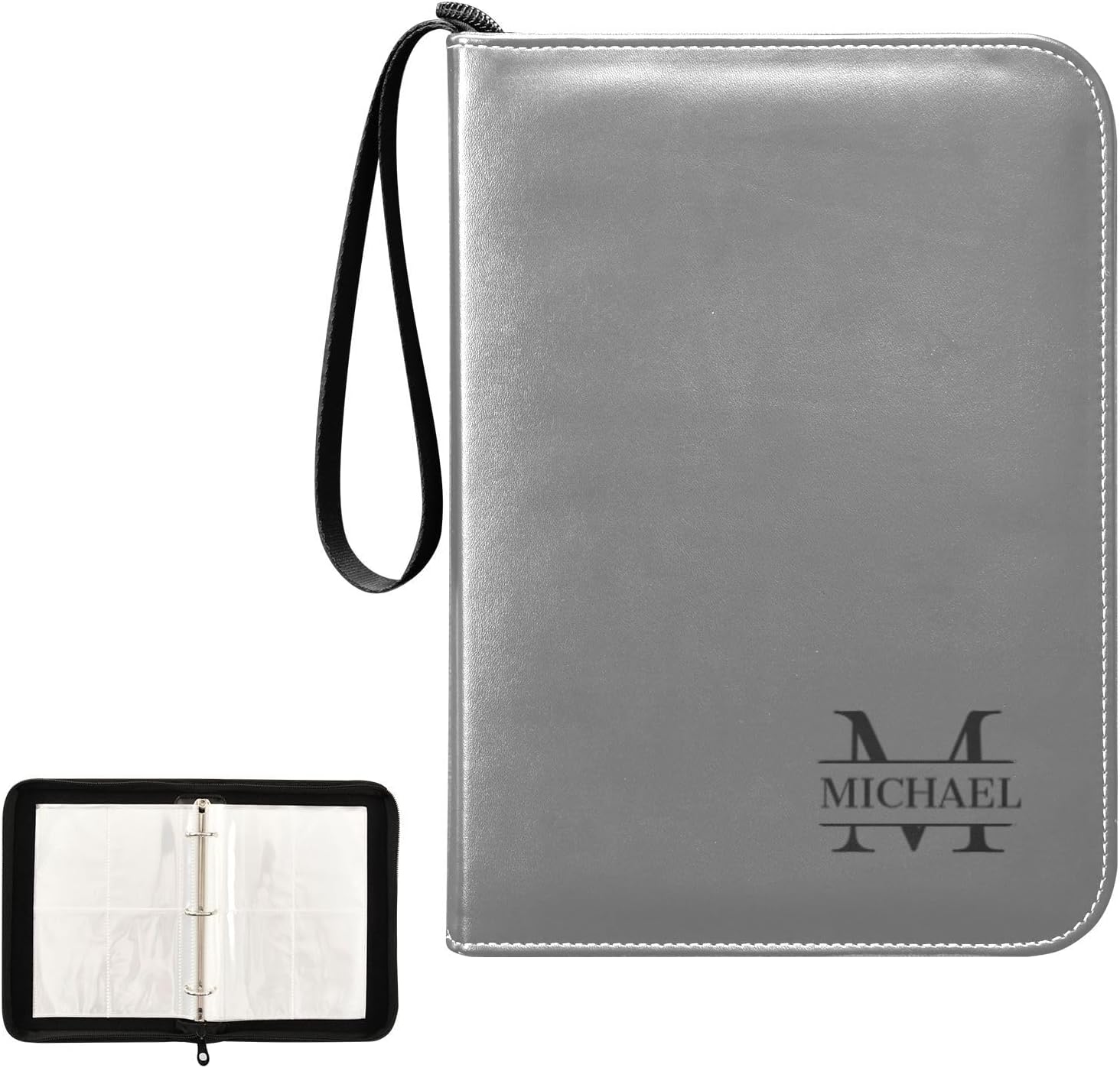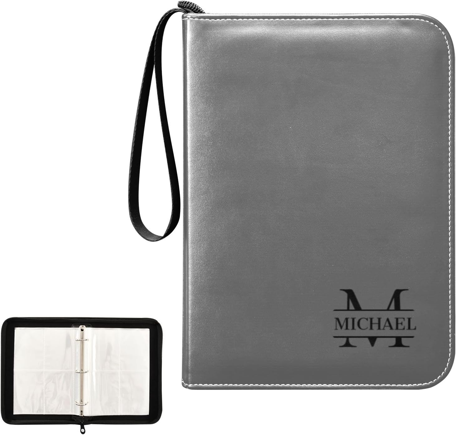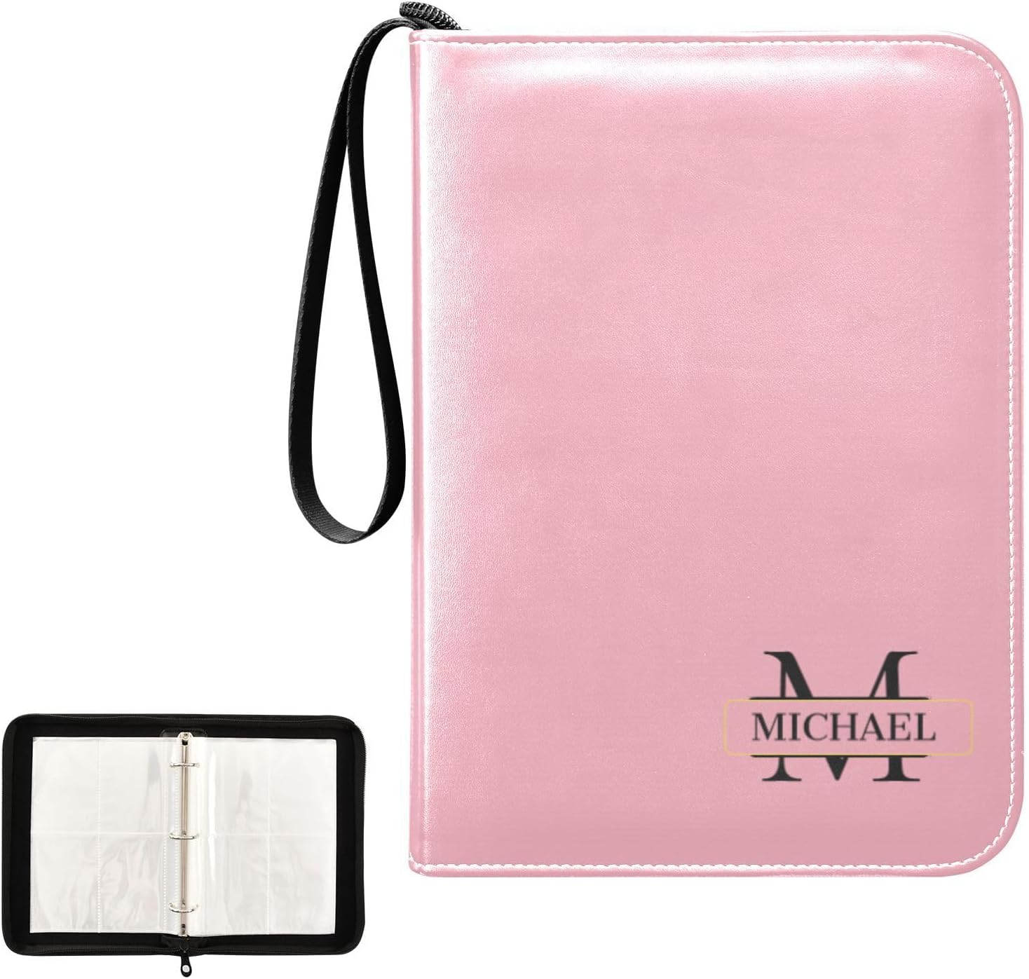Many details of our trading cards binder · The 3-ring Mental Buckle: Designed with a 3-ring metal buckle for durability and the ability to adjust the page position at will to keep your card collection organized. · Durable Wristband: Our card binder is equipped with a durable wristband for easy carrying and added convenience, perfect for on-the-go collecting. · High-quality & Waterproof Materials: Our card collector is crafted with high-quality waterproof PU leather materials and smooth surface, easy to clean and protect your collection from water and dirt. · Can Hold 400 Game Cards: With a large capacity to hold up to 400 game cards, this binder is ideal for card collectors and enthusiasts. · Unique Custom Card Binder: The specially custom designed card binder allows for the classification of different collection cards, like soccer cards, baseball cards, making organization and management easy. It can also be used as a special holiday gift or birthday gift, believing it will be a very memorable gift. Information of our card collectors · Each Pocket Size: 3.77*2.87 inches · Card Binder Size: 9.64*6.88*1.96 inches · Materials: PU Leather